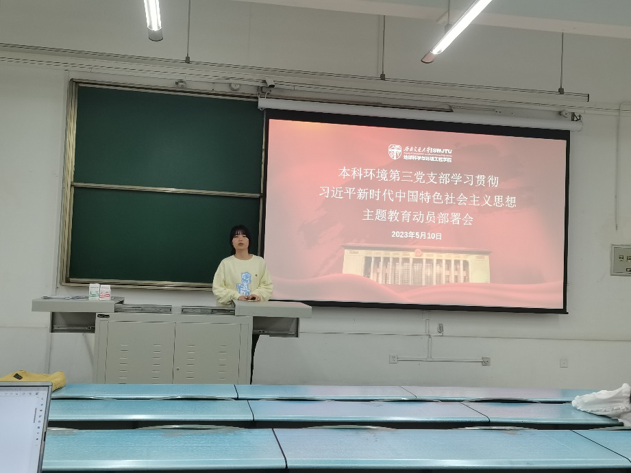 2023年5月10日晚1900,本科环境第党支部X2213开展了“学习贯彻习近平新时代中国特色社会主义思想”主题教育动员部署会,会议主题是传达校、公司党委关于主题教育部署的相关精神和结合支部情况规划日后主题教育时间安排。本次大会由支部书记钟若兰同志主持,本科环境第党支部全体党员参与。
