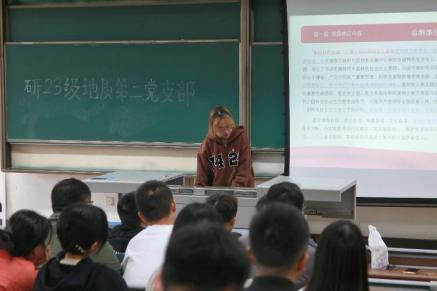 2023 10 18 日,研 2023 级地质第二党支部于九里校区四号教学楼 J4509 开展了以 “学习二十大,争做新青年 ”为主题的党日活动。本次活动由党支部书记黄丽敏主持,共到党员 9 名, 支部成员共计 21 人与会。