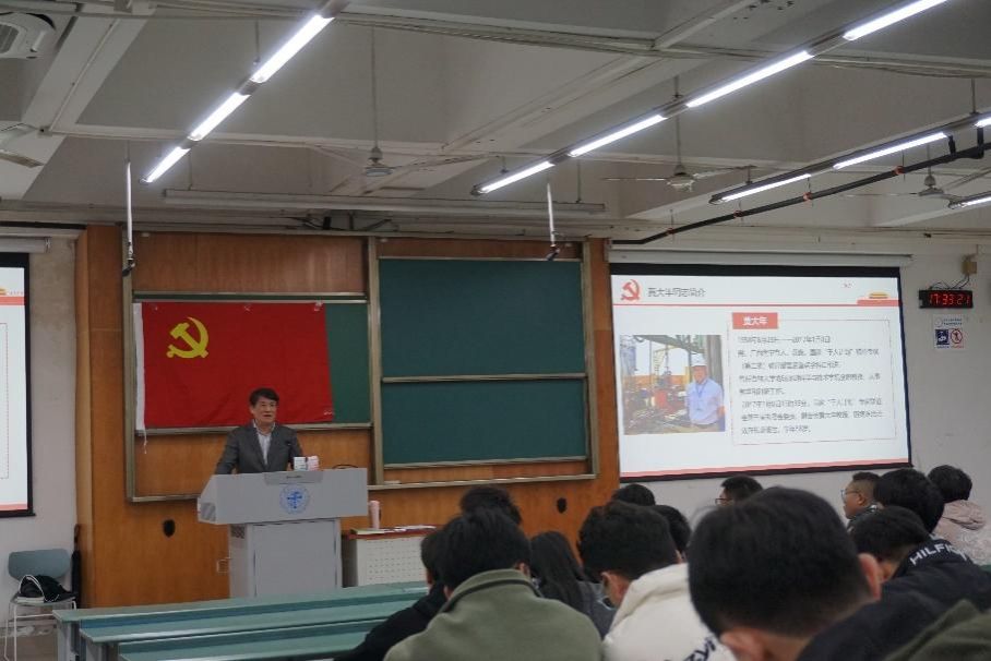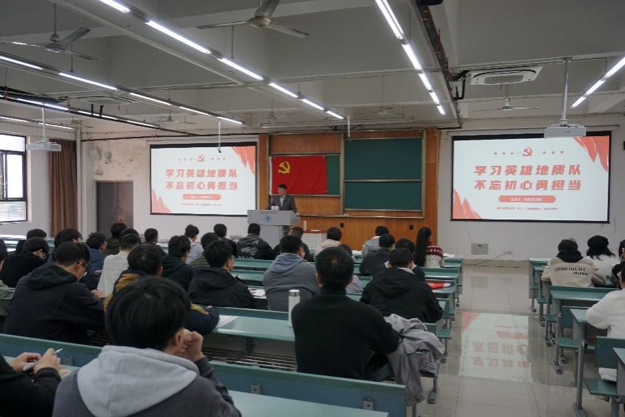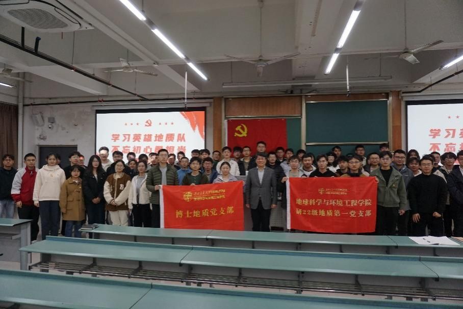 2023年11月22日,委胡卸文教授在犀浦校区X4350教室为博士地质党支部、研22、23级地质第一、第二党支部的同学们讲授了一堂名为“学习英雄地质队,不忘初心勇担当”的专题党课。党课内容主要包括三部分:学习习近平给山东省地矿局第六地质大队全体地质工作者的回信精神,学习李四光精神,以及学习黄大年精神。