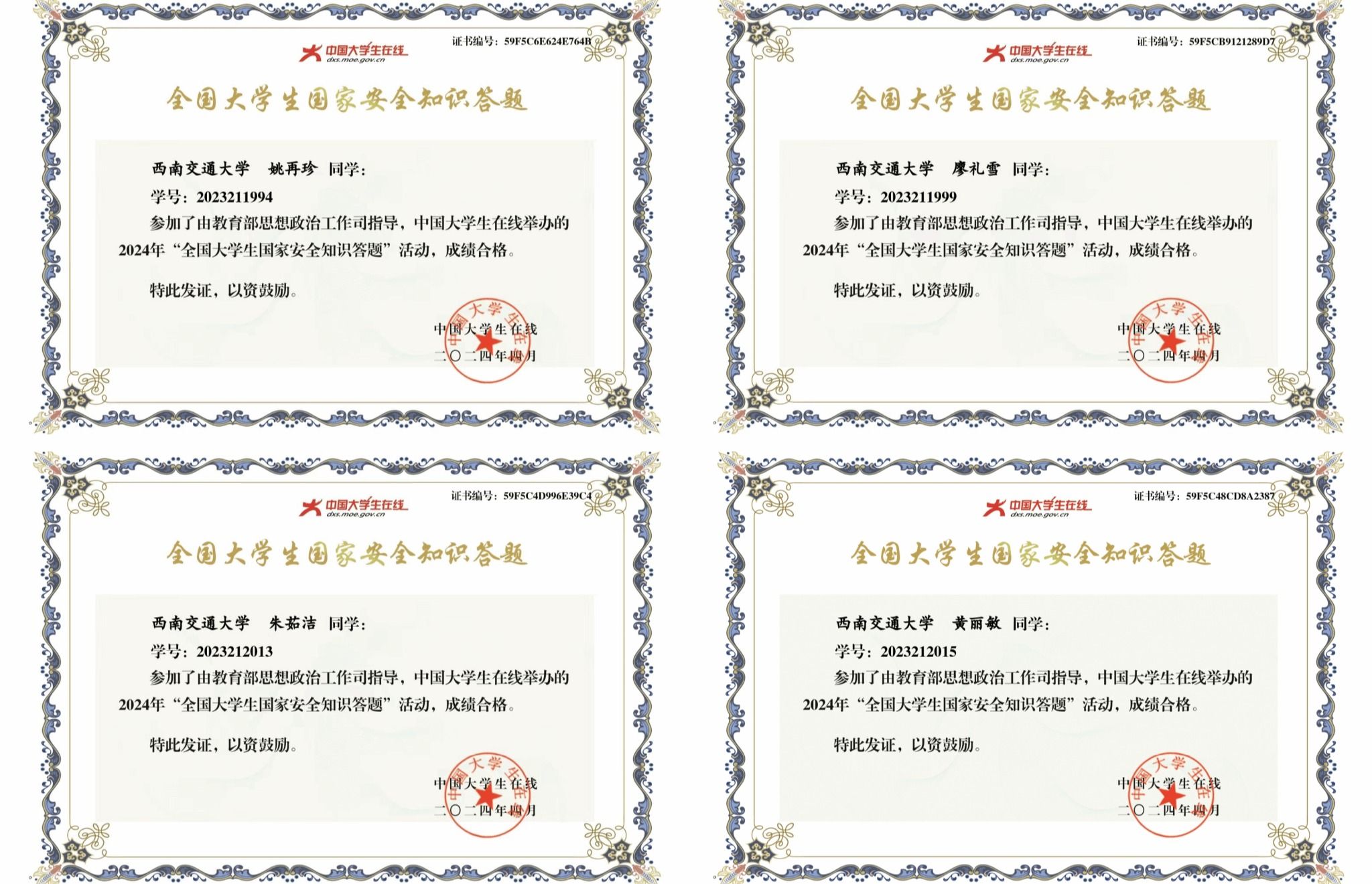 为响应学院号召,支部成员在直播结束后,积极参与了“全国老员工国家安全知识答题”活动。本次活动旨在通过线上答题的方式,普及国家安全知识,提升老员工的国家安全意识。支部中多位同学积极参与了答题活动,并获得了国家安全知识竞赛证书。他们表示,通过答题,不仅巩固了国家安全知识,还进一步认识到了国家安全的重要性。