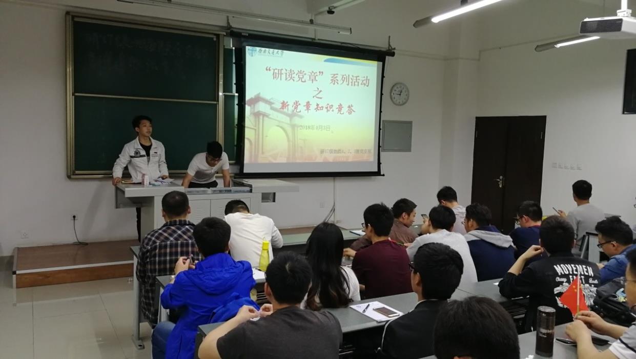 43日晚上,研17级地质三班党支部联合研17级地质、二班党支部全体党员以及积极分子在X9239教室开展了“研读党章”主题党日活动,活动采用新党章知识竞答的方式。活动由党支部书记袁彬、何江、李志浩共同主持