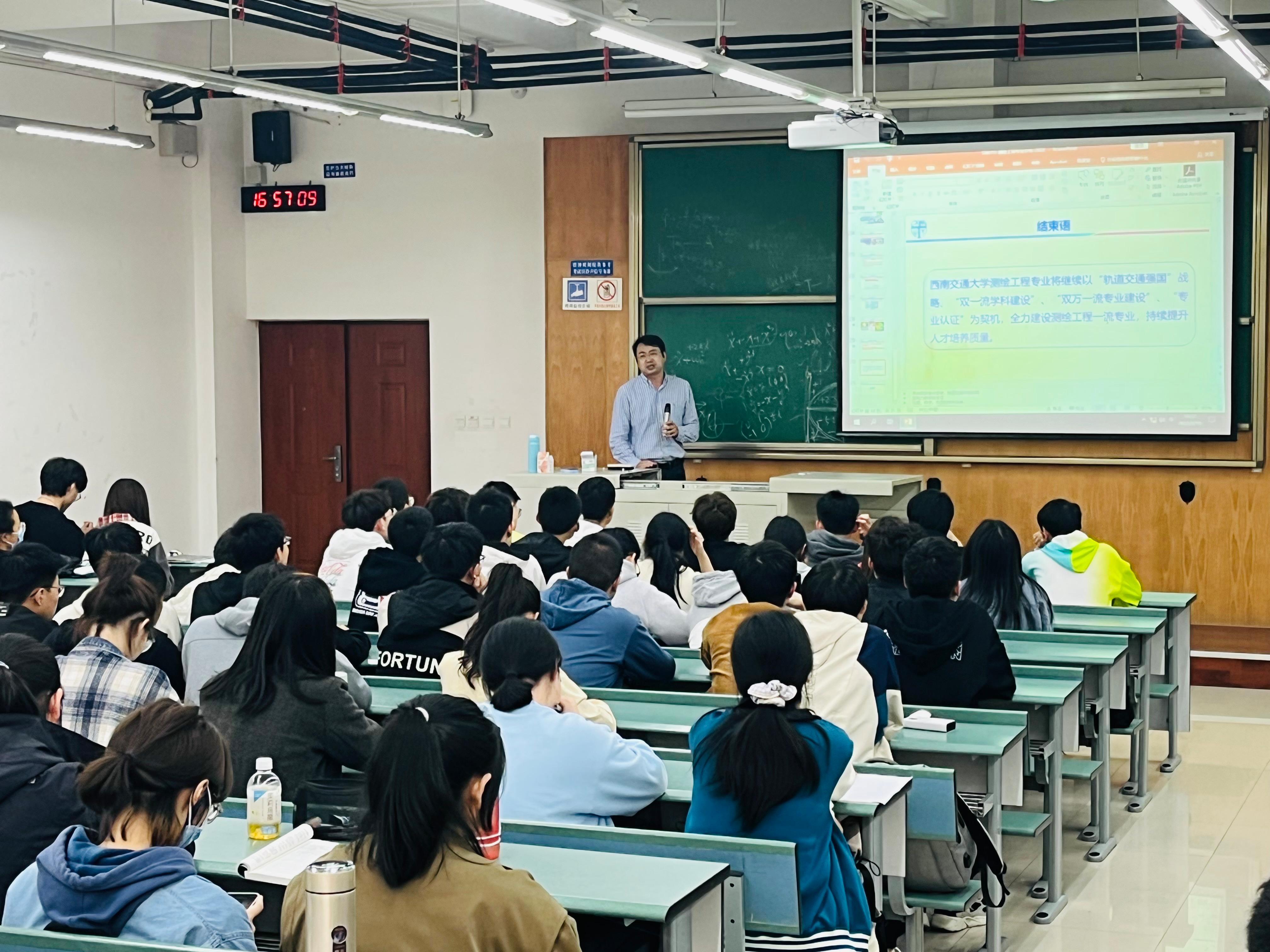 宣讲会开始,游为老师从专业的发展历史、团队力量、培养目标、专业定位、就业前景以及学科发展情况等方面对测绘工程专业进行了详细的介绍,改变了同学们对测绘工程专业的传统认知。同时,游为老师向同学们展示了公司测绘工程专业在铁路行业所取得的重大成就。他表示,不管是在珠峰高程测量,还是高速铁路精密测量,测绘工程专业都将发挥其重要作用。