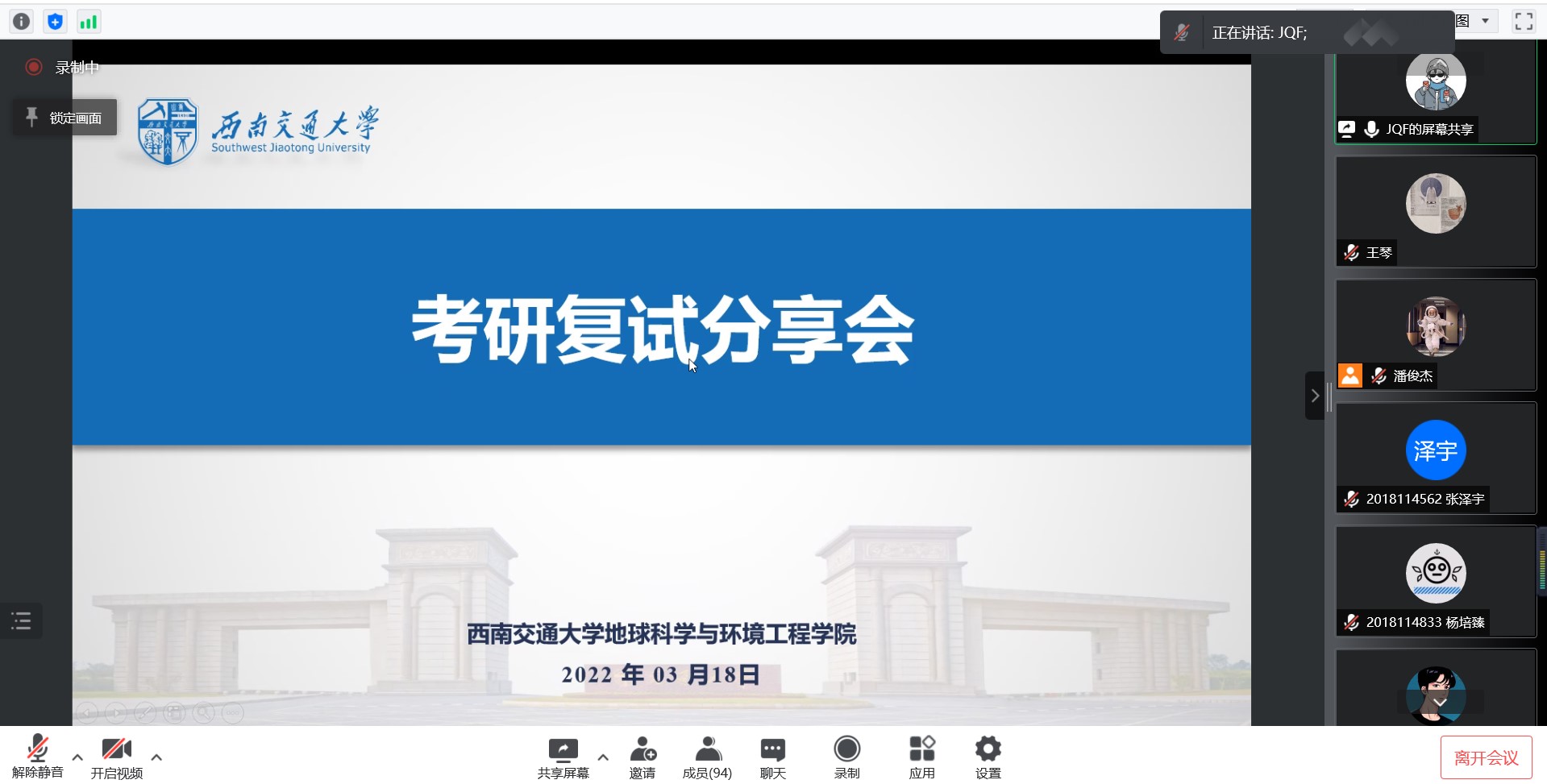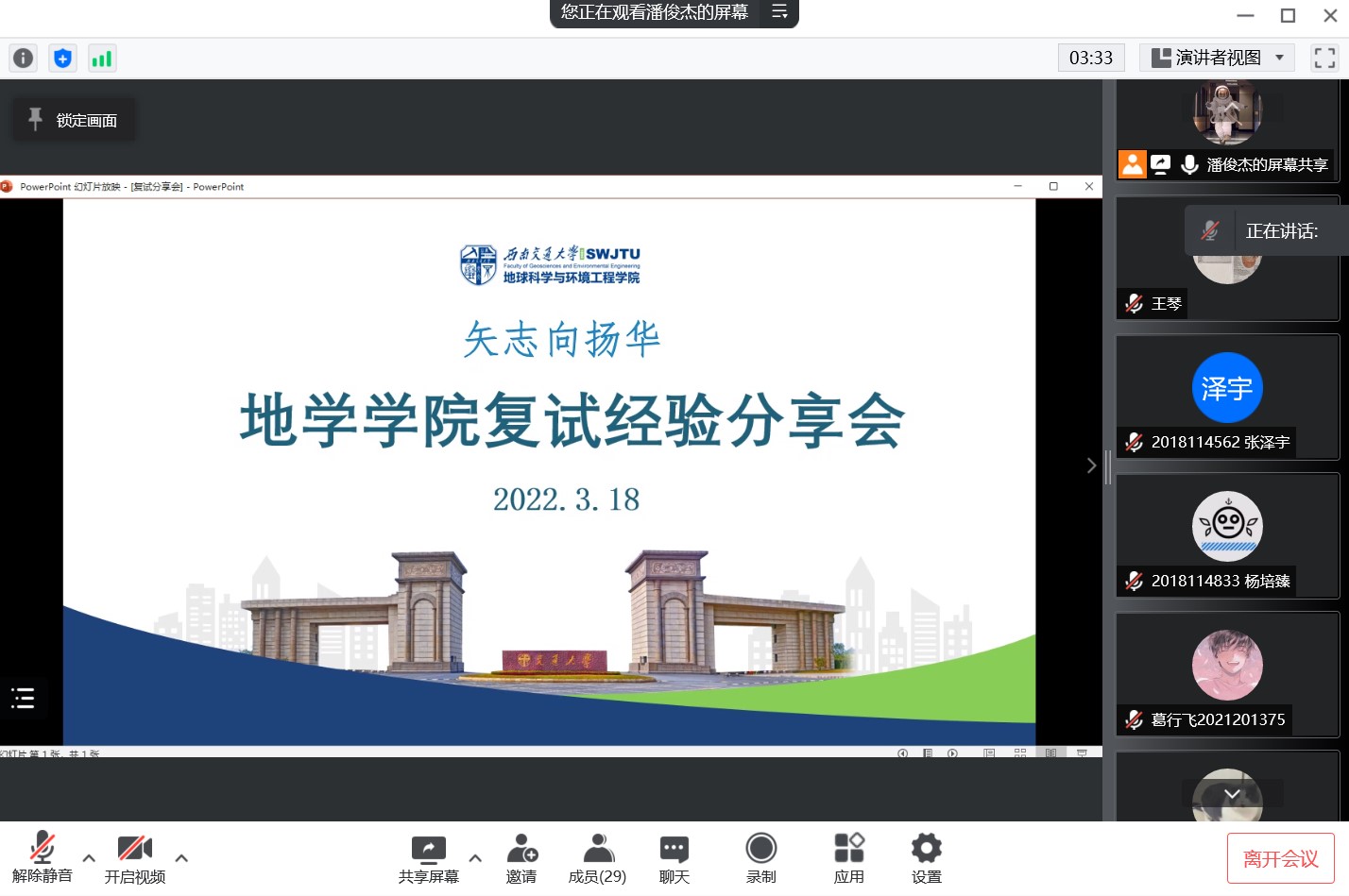威廉体育williamhill研究生会于2022年3月18日在腾讯会议成功举行了考研复试经验分享会,本次分享会面向2022届预报考公司研究生的同学,旨帮助同学建立复试信心,进而促进公司复试工作的顺利进行,本次复试经验分享会邀请到了2021级测绘、地质、资环三个专业的复试优秀代表,为2022届预报名公司研究生的同学分享他们在考研复试过程中的心得体会。