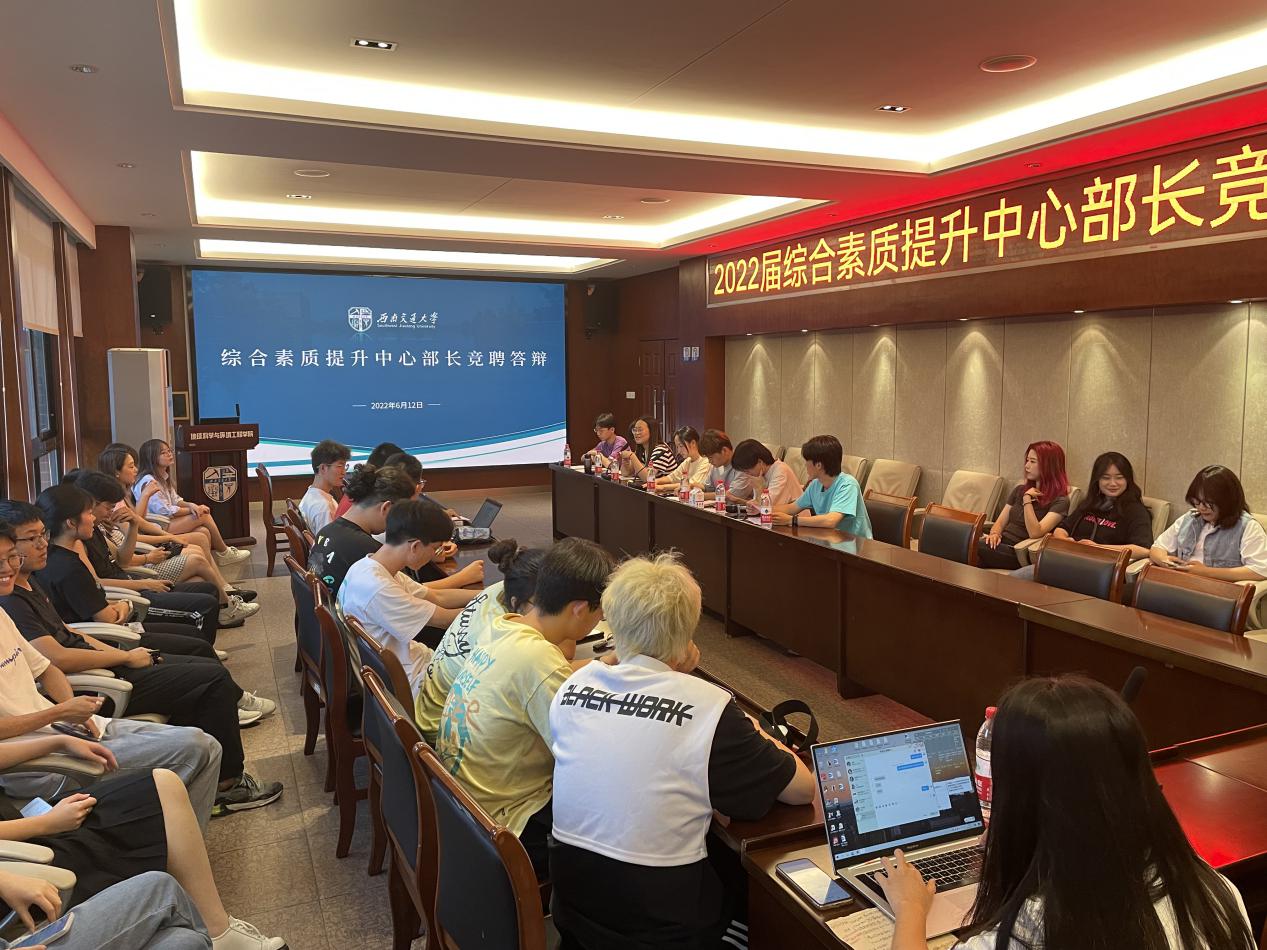 2022年6月12日晚7点半,2021-2022学年综合素质提升中心学年工作总结暨第二届综合素质提升中心干部留任竞选大会在X4520召开。参会人员有:综合素质提升中心指导老师董可老师,员工会主席陈荩娜,综合素质提升中心主席团成员李京伦、马明宇、艾依萍、叶逸辉、卡米浪,综合素质提升中心部长团以及参加竞选答辩的17位候选人。