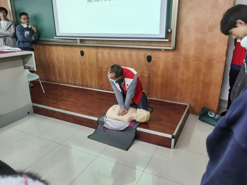 下午13点至17点,红十字会老师讲解应对气道异物梗阻的处理办法。通过列举几个生活中实际发生的案例,向同学们展示了气道异物梗阻的危险性,以及在这种情况下如何进行应急处理。接下来,红会老师讲述了生活中引起心搏骤停的因素、临场心搏骤停的判别方法、以及心肺复苏的正确操作流程。在理论讲解之后,红会老师借助教具模型为同学们演示了如何正确进行心肺复苏。通过结合理论与实践的学习,同学们渐入佳境,积极与老师配合协助完成示例,并练习心肺复苏操作。