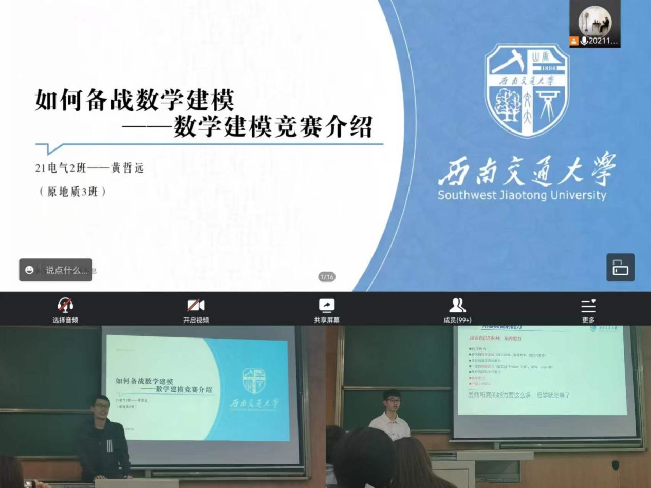 第一场讲座于10月22日晚在犀浦校区X4155线下线上同步进行。讲座主题为“数学建模竞赛经验分享”。威廉体育williamhill学习与科创中心邀请了黄哲远与林朝标两位优秀同学向威廉体育williamhill同学讲解了数学建模竞赛的相关内容并做经验分享。