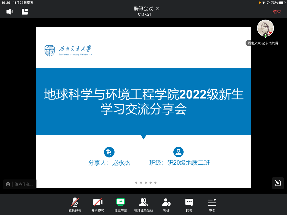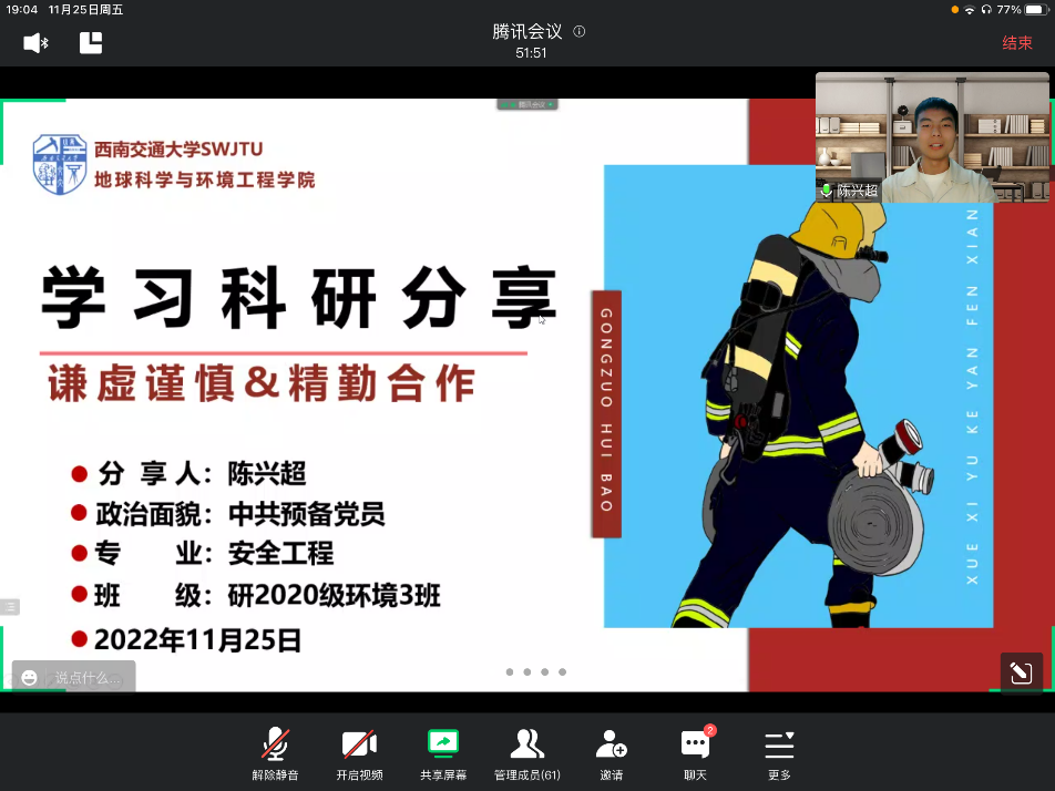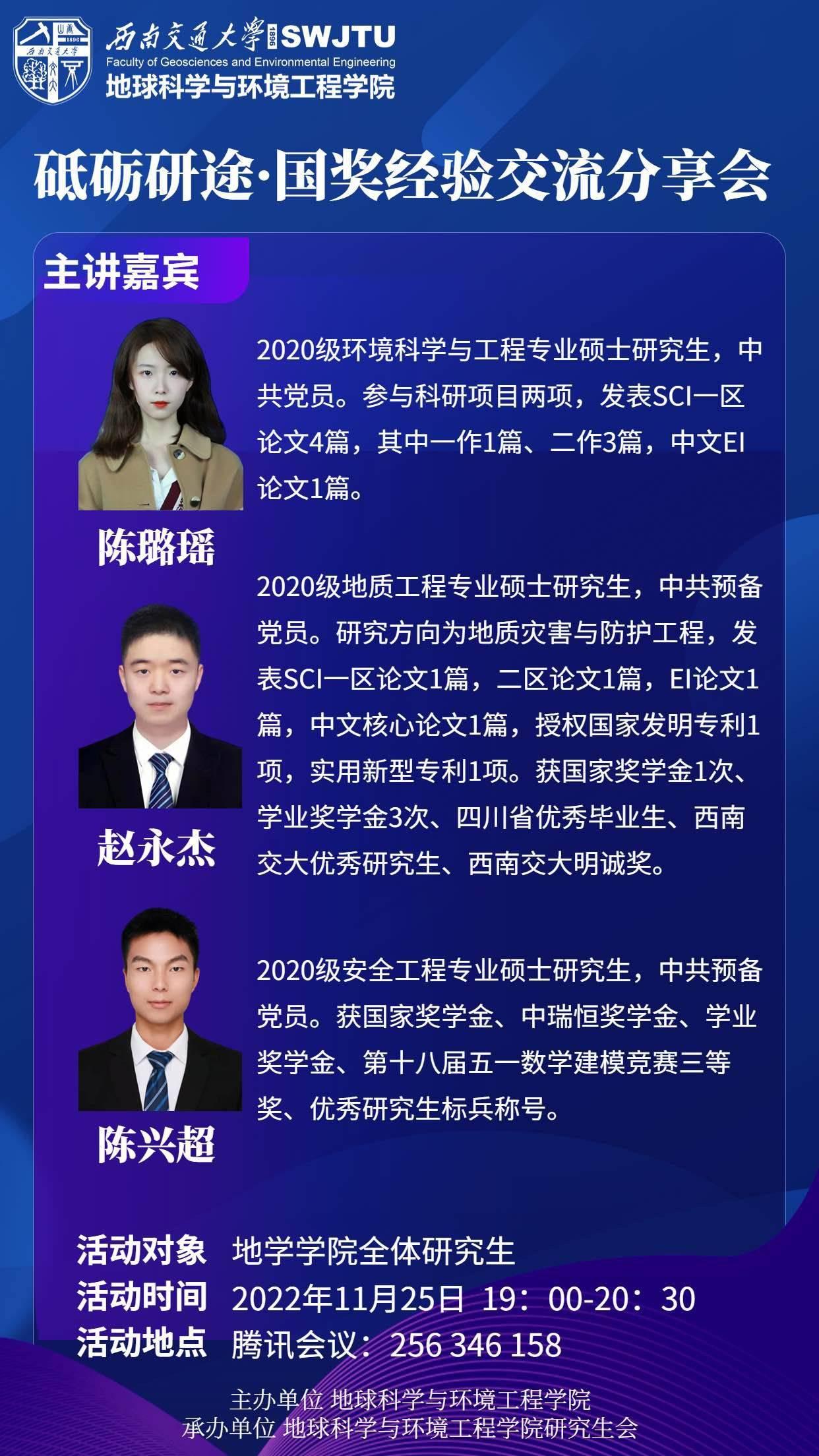 为弘扬求实、创新、协作、牺牲、自律的科研精神,激励公司学研究生精勤求学、奋发向上,11月25日,2022年国奖经验交流分享会于线上举行,由威廉体育williamhill研究生会主办。此次会议邀请2022年公司三位国奖获得者,分别是陈兴超、赵永杰、陈璐瑶,为公司全体研究生分享经验。