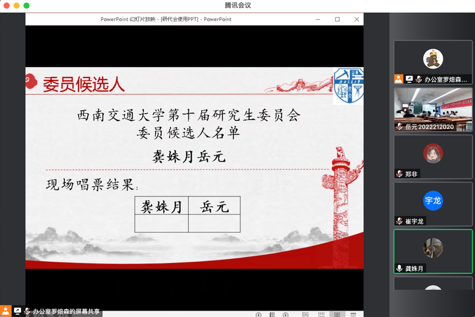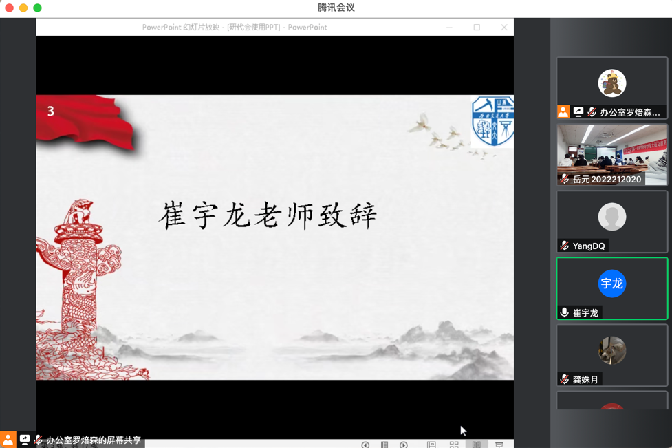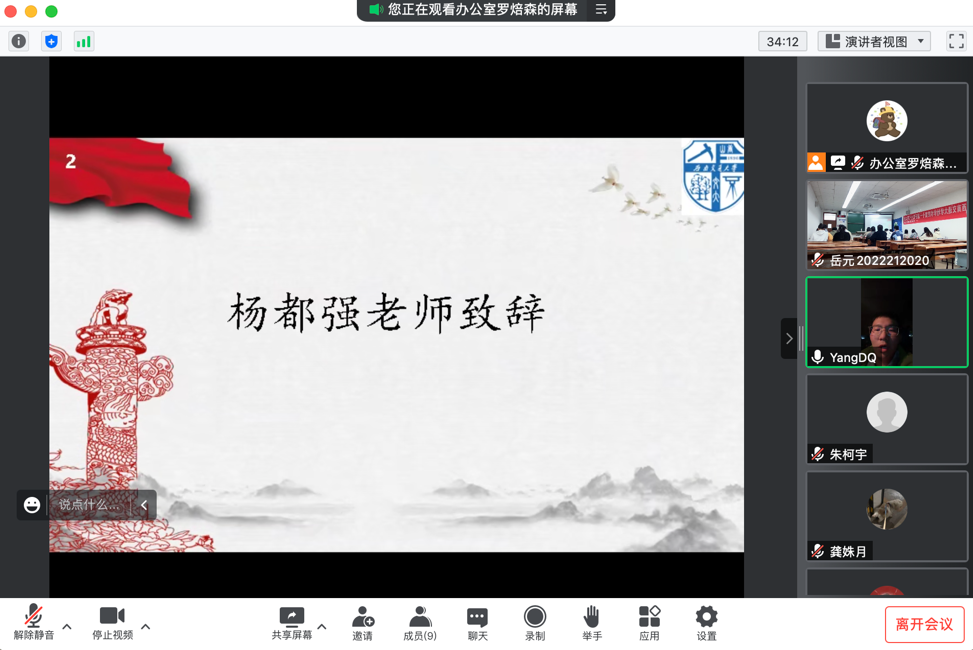 2022年11月12日下午,威廉体育williamhill研究生会在公司党委的领导下,在学院团委的指导下于九里J4304A教室成功举办威廉体育williamhill第十一次研究生代表大会。本次会议采取线上线下同时进行,威廉体育williamhill团委书记杨都强老师、团委副书记兼研会指导老师崔宇龙老师、12名研究生代表以及研会成员出席会议。