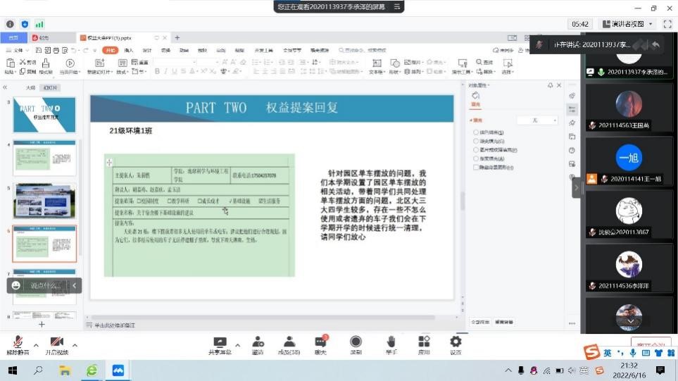 紧接着,员工会权益服务部部长杨伊涛对收集的部分权益提案进行了解答和回复,给出了将先前调研收集到的结果向学校领导汇报反映后得到的反馈,针对问题给出了解决措施。