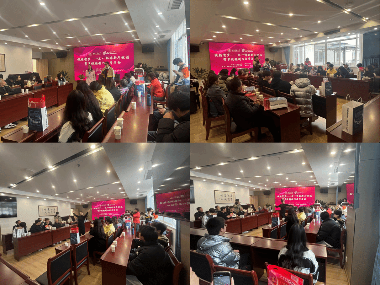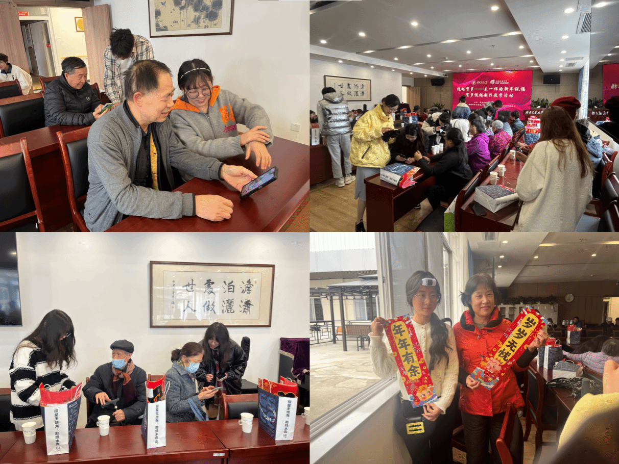 活动期间,为协助老教师拍摄新年祝福视频,员工们与退休教职工进行深入交流,分享如何拍摄和制作小视频。同学们在场地摆设、音乐选择、软件使用等方面,向老教师们提供了建议和帮助。老教师们也向交大全体师生送出新年祝福:“祝同学们学业有成,祝大家万事如意,新年快乐,文轨车书郅大同。”亲切的祝福语中,包含了老教师对同学的殷切期望和对全校师生的浓浓关怀。