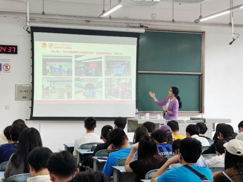 团课伊始,韩沁儒老师以“硬联通、软联通、心相通”为主线,系统梳理了学院在实践育人方面的丰硕成果。在“硬联通”方面,聚焦川藏铁路博士建设服务团:五年间,团队暑期扎根沿线工程段,开展地质勘察与技术调研,以实际行动服务国家重大工程,彰显“交通强国”使命担当。“软联通”部分,韩老师分享了“红石榴训练营”通过文化沙龙和专题研学强化中华民族共同体意识的经验,并展示了优秀员工访谈成果,为同学们的成长路径提供有益参考。“心相通”环节,则通过介绍团学组织深入社区开展课业辅导、走进乡村助力农业发展的志愿服务案例,呈现青年学子与社会的深度融合,树立了社会化能力培养的生动典范。