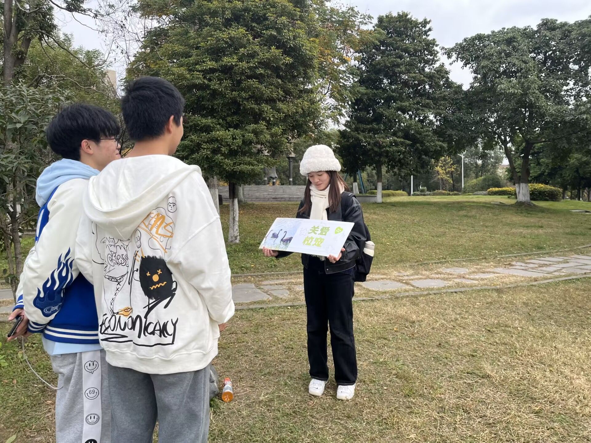 另一队同学,拿着牌子,为每一个前往观看天鹅的人们耐心仔细的宣传着校宠的保护观念,倡导关爱我们身边的小动物,每一个生命都值得被温柔对待!
