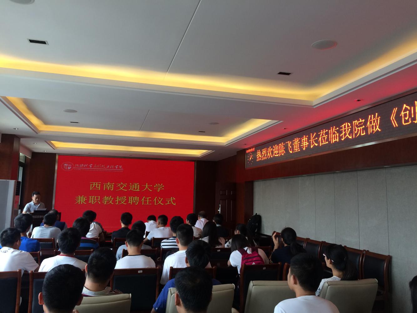 公司徐瑞堂书记为陈飞董事长颁发学院兼职教授聘书。聘任仪式结束后,陈飞教授做了题为《创业人生》的报告: