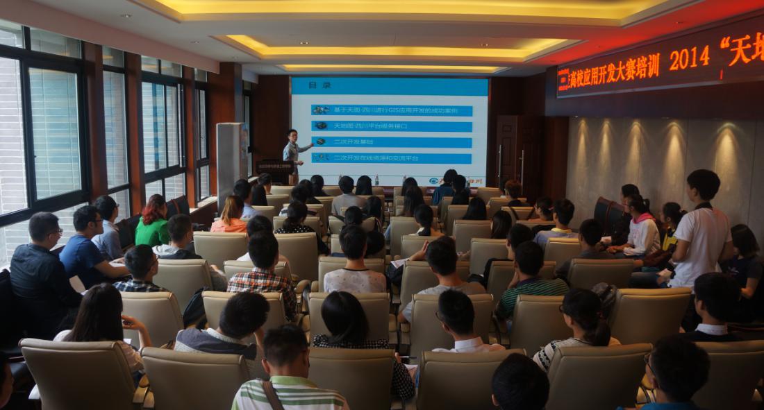 2014年9月27日,“天地图·四川”进高校应用开发大赛培训活动在威廉希尔williamhill官网犀浦校区成功举行。“天地图·四川”进高校应用开发大赛由四川省测绘局基础地理信息中心主办,四川省测绘学会教育与科学普及工作委员会及四川省测绘学会地图制图与GIS专业委员会联合承办。