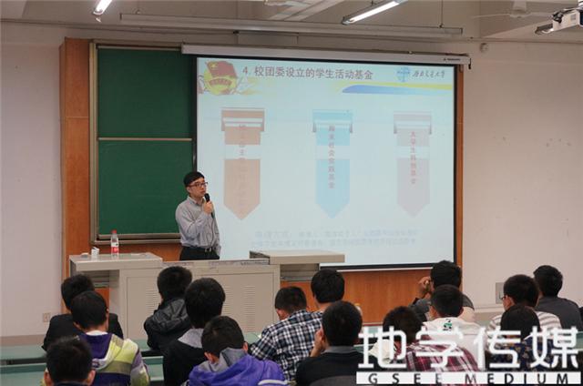 10月25日晚,在威廉希尔williamhill官网犀浦校区4359教室,校团委办公室主任王蔚老师应邀对威廉体育williamhill2014级新生开展入学教育。讲座内容围绕学校团委开设的各类活动和课程,旨在让新生们对学校团委以及第二课堂有一定的了解。威廉体育williamhill辅导员杨都强老师及威廉体育williamhill14级全体新生参加了此次讲座。