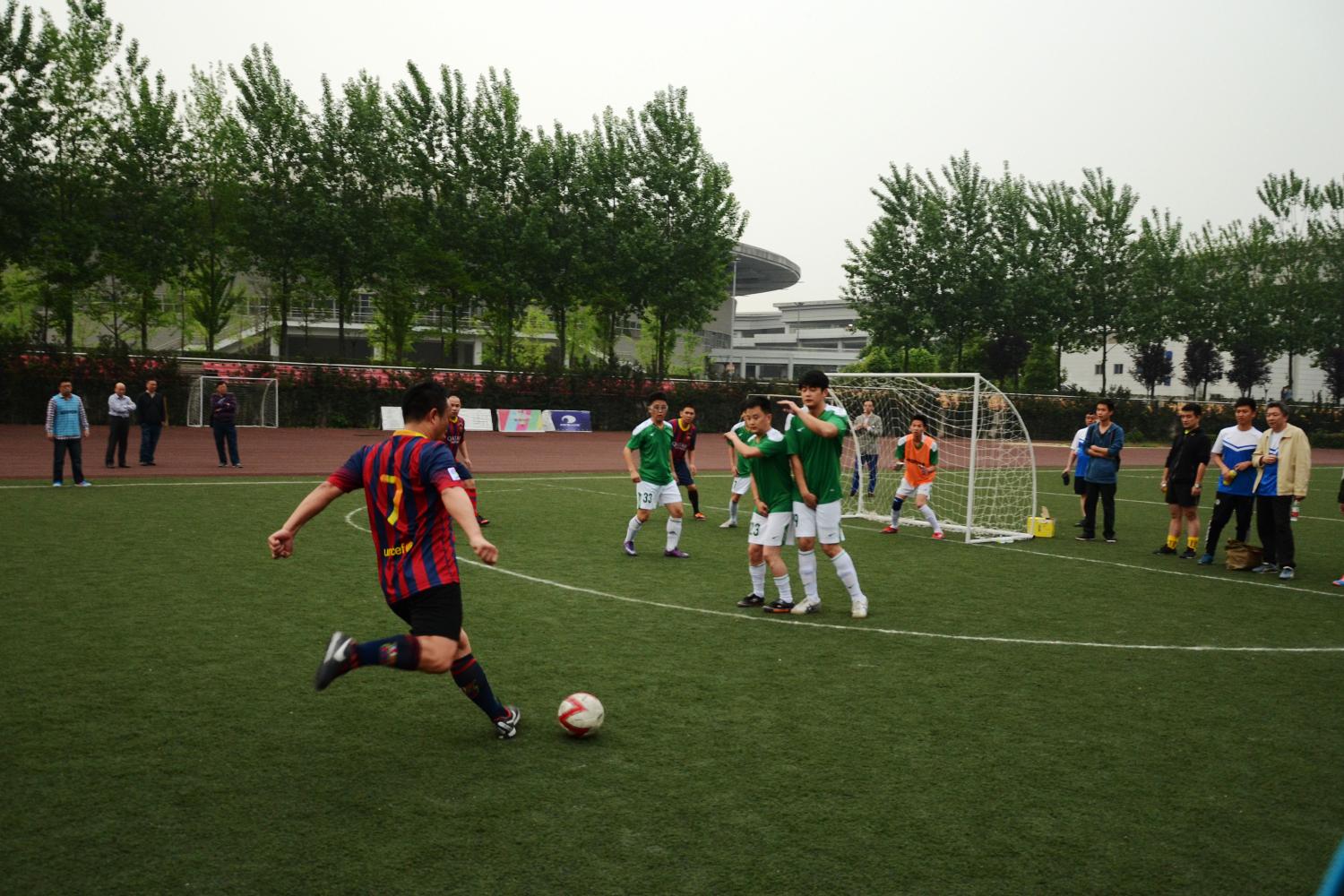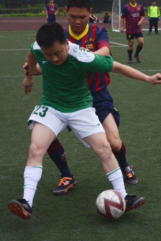 面对宿敌,公司队伍丝毫不敢懈怠,保持高度集中的精神,对每一个对方球员严防死守。比赛不过三分钟,我方7号球员刘了老师在对方门前便觅得一次头球机会,虽然球只是滑过左侧门柱,并未得分,但我们士气高涨。不久,7号球员中场断球,这次,7号球员沉着应对,带球向右突破,连过三人,在底线处和对方门将形成单刀之势,然后突然起右脚抽射,对方门将猝不及防,球进了!!!这一关键性的进球,大大提高了公司球员战胜强敌的信心。接下来失球的交运学院代表队加大攻势,几度射门未果。我方球员亦加大防守力度,未让对手获得任何可乘之机。