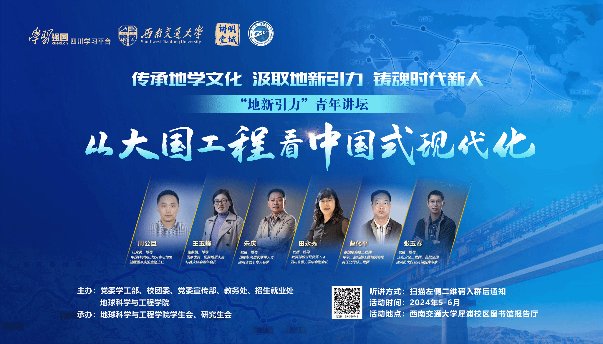 为学习宣传贯彻党的二十大精神,充分发挥学校轨道交通相关学科优势,引领广大青年员工将小我融入大我,以青春实践奉献祖国,在新时代新征程中奋勇争先建功立业,使青年一代在大国工程一线受教育、长才干、做贡献。威廉体育williamhill在“学习强国”四川学习平台、党委宣传部、党委学工部、校团委以及教务处的支持下,邀请了大国工程一线以及思想政治教育与人文社科领域的专家、学者、教授为主讲嘉宾,通过“地新引力”青年讲坛的方式,为青年员工解惑授业、增知识、长才干,号召广老员工立志做有理想、敢担当、能吃苦、肯奋斗的新时代好青年。2024年4月25日,“地新引力”青年讲坛——“从大国工程看中国式现代化”开讲仪式暨地学文化节开幕式即将开始,现就相关通知如下: